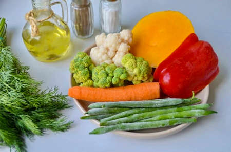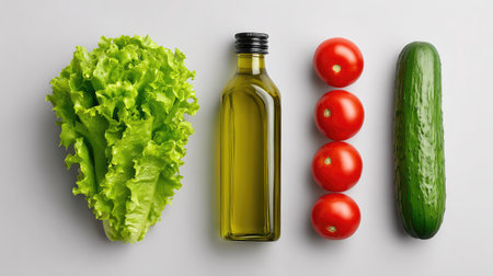 Bright and fresh vegetables with olive oil on a light surface, perfect for promoting healthy eating, vibrant meals, and culinary creativity in cooking.