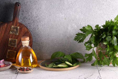 Fresh herbs with vegetables and oil on gray background