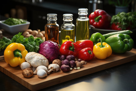 Cutting board with colorful vegetables on a clean kitchen countertop., generative AI