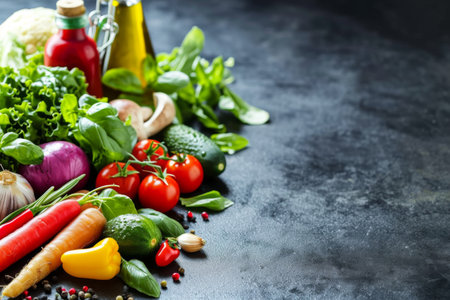 Fresh organic vegetables and herbs on black stone table. Healthy food background