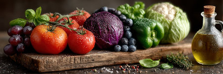 A collection of fresh vegetables, including tomatoes, cabbage, and bell peppers, is arranged on a wooden board. The vibrant colors of the produce contrast with the rustic wood. A bottle of olive oil sits nearby, suggesting culinary use. Suitable for various editorial and commercial applications.