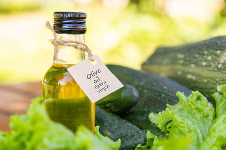 Olive oil in a small glass bottle with a cardboard label on the background of green lettuce leaves and zucchini in the fresh air in the sunlight. The concept of healthy and natural food