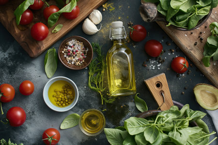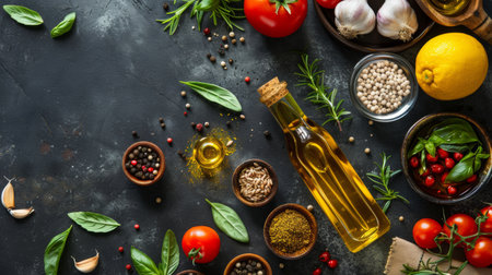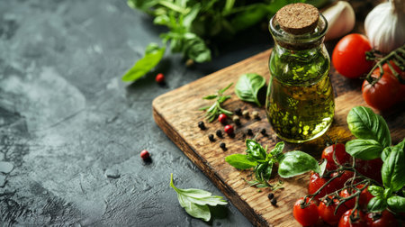 Rustic composition of olive oil in a glass bottle, fresh herbs, cherry tomatoes, and spices on a wooden board with a textured dark background.