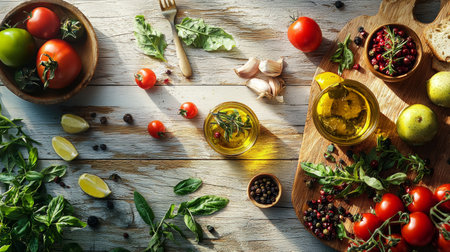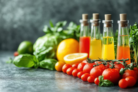 Fresh vegetables, citrus fruits, and colorful oils are artistically arranged for meal preparation.