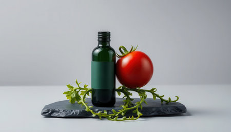 Natural cosmetic product mockup. A green bottle with a blank label for branding sits with a fresh red tomato on a slate stone against a gray background.