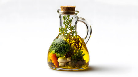 Organic Farm Vegetable Oil in Decanter on White Background