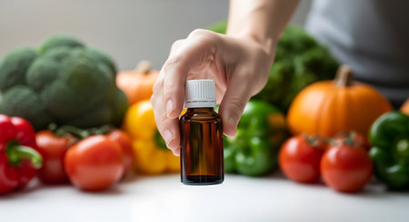 A hand holds an amber bottle with a white cap. Behind the bottle are various colorful vegetables including broccoli, tomatoes, peppers, and pumpkins. The vegetables are out of focus.