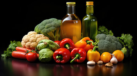 This stunning image captures a bottle of olive oil surrounded by a variety of fresh vegetables and soybeans, perfect for culinary creations and healthy recipes.