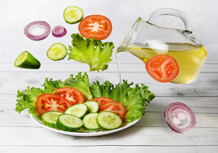 Vegetable salad with olive oil in levitation. Vegetable salad of tomatoes, cucumbers and green salad with vegetable oil.