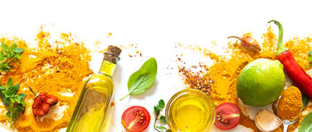 Herbs, spices and olive oil on white background
