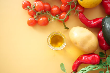 Fresh vegetables and olive oil arranged on a yellow background