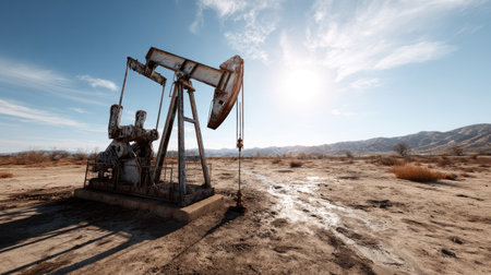 A rustic oil pump jack stands prominently in an arid landscape, surrounded by dry earth and distant mountains, illuminated by bright sunlight.