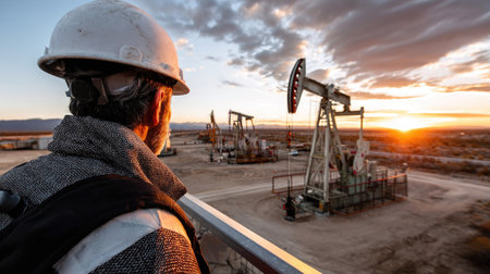 A worker in safety gear stands against the backdrop of an oil pump jack at sunset, capturing the essence of industrial energy production in a serene landscape.