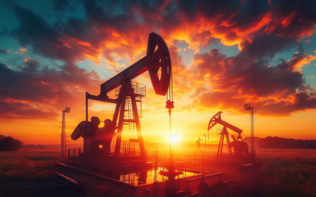 A worker in a helmet stands silhouetted against a stunning sunset, observing an oil pump jack at work in an industrial oil field. The image captures the intersection of nature and energy.