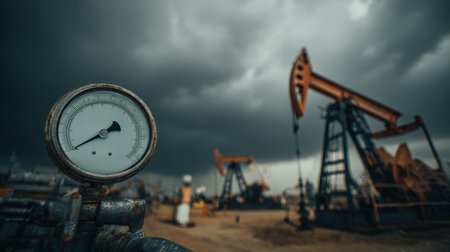 A cinematic shot capturing a storm approaching an oilfield. A pressure gauge reflects dark clouds, while a pumpjack is partially obscured, creating a tense and dramatic mood.