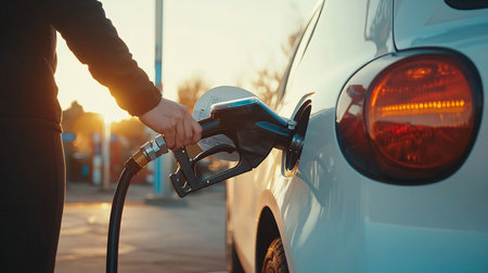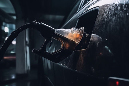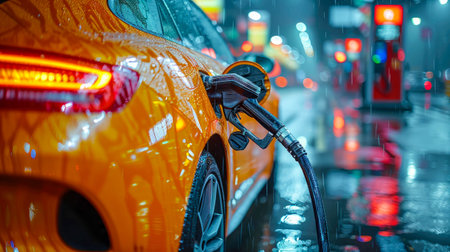Fuel nozzle pumping gasoline into a wet car tank at a gas station during sunset, with glistening water drops adorning the vehicle's surface, creating a captivating scene