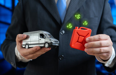 Fuel economy for freight transportation. Businessman with canister and van. Symbol of logistics, rising petrol and diesel costs, transport challenges, and global energy markets.