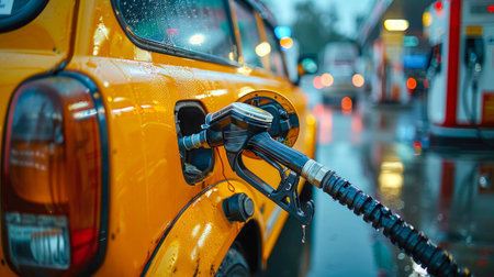 Close-up of a car being refueled at a gas station on a rainy day. The background is blurred, focusing on the fuel nozzle. Concept of transportation.