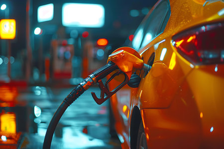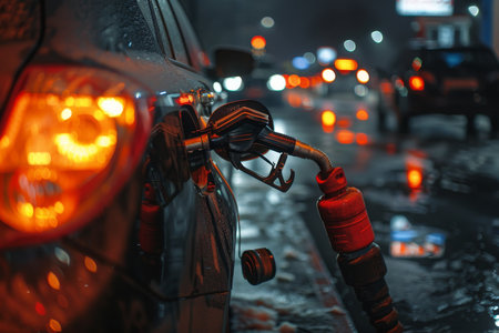Red fuel nozzle inserted in car tank, refueling vehicle at gas station at night, symbolizing road trip, transportation, energy consumption, and automotive industry