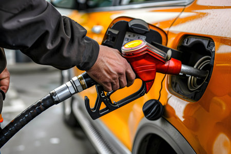 A close-up view of a hand gripping a fuel nozzle, preparing to refuel a car at a service station, showcasing the process of fueling in daily life.