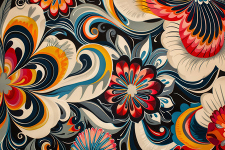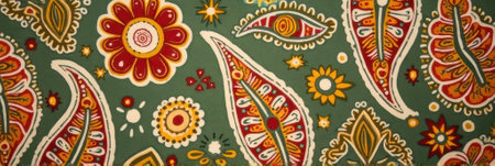 Vibrant floral paisley pattern with bold colors and intricate details on green background. That the image is generated using AI.
