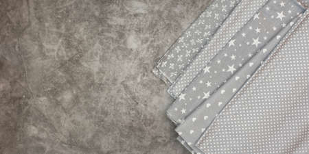 Natural gray fabrics and textiles on gray background. Sewing industry concept. With copy space.