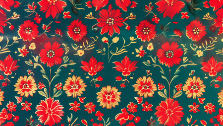 Floral seamless pattern with red and gold flowers blooming on a teal background, creating a vintage and decorative design. Ai generated image