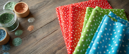 A vibrant arrangement of polka dot fabrics in red, green, and blue is beautifully complemented by jars of sparkling glitter on a rustic wooden surface. This lively scene evokes a sense of creativity and playfulness, perfect for crafting enthusiasts and DIY projects.