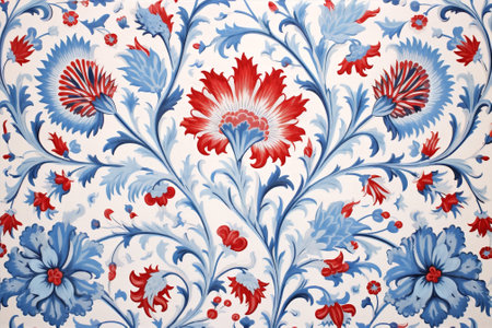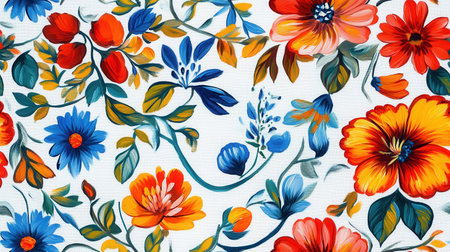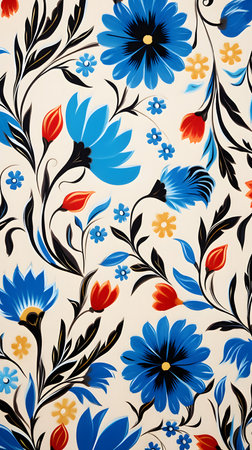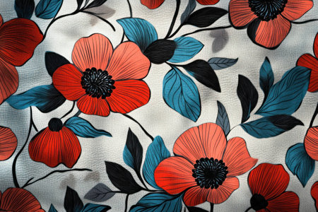 Vibrant floral pattern featuring red and blue flowers on a light background, ideal for fabric or wallpaper design, capturing a fresh and modern aesthetic