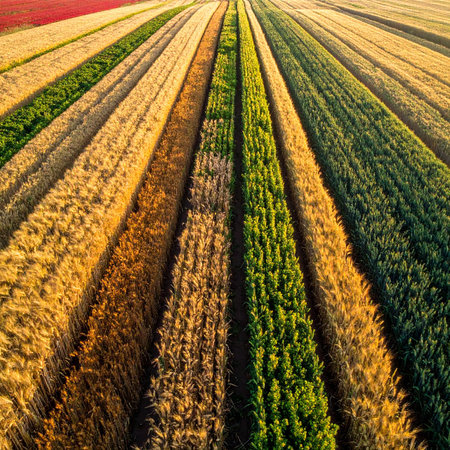 Expansive agricultural fields showcase neat rows of vibrant green crops and golden wheat under a vast sky with...