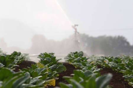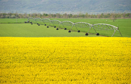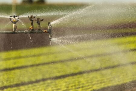 Automated farming irrigation sprinklers system on cultivated agricultural landscape field