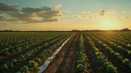Vast cabbage field under a blue sky at sunset a lush agricultural landscape of healthy growth