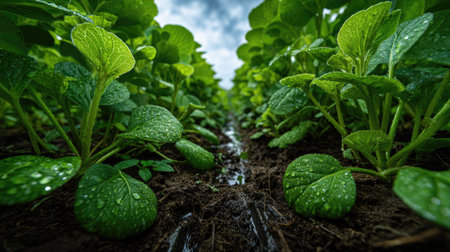 This image captures a close-up view of sunflower plants in a flourishing field, highlighting vibrant blooms and rich soil, evoking serenity in nature.