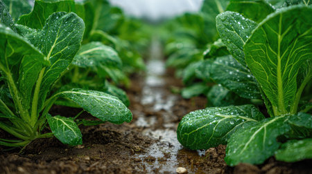 A panoramic wide view of Tatsoi field growing closely together after rain wet leaves reflecting soft light fresh soil visible ultra realistic photography cinematic wide composition lifelike natural scene