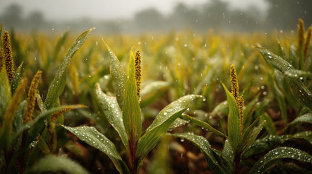 A panoramic wide view of Little millet field growing closely together under light drizzle soft raindrops on leaves ultra realistic photography natural daylight cinematic wide composition lifelike natural scene