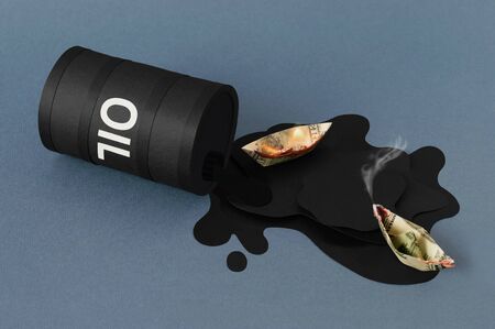 Oil spills from barrels and burning dollar boats. Concept to reduce production or oil prices, complicated by coronavirus pandemic. World financial and oil crisis. Made from paper. Paper art