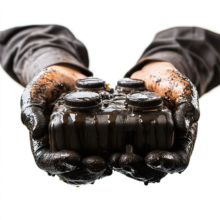 Hands grasp thick black crude oil, illustrating the texture and viscosity of this natural resource in a controlled environment.