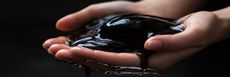 Hands grip thick black crude oil, emphasizing the rich texture and color of this natural resource against a smooth, dark surface.