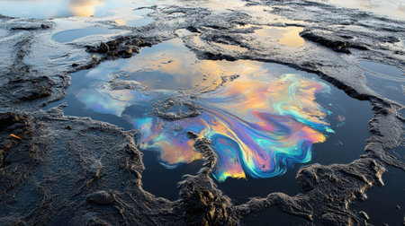 A mesmerizing scene showcasing a colorful oil slick reflecting vibrant hues on dark soil at sunset. This artwork highlights nature's beauty and environmental impact.