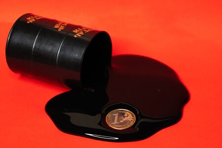 oil flowing out of the barrel with a one euro coin on a red background