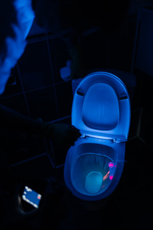 Vertical shot of toilet bowl illuminating under ultraviolet light, revealing hidden traces of dirt, bacteria and germs, highlighting need for deep hygiene and effective bathroom cleaning, nobody.