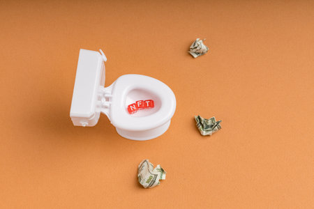 scattered banknotes around the toilet. nft inscription inside the toilet bowl. is it worth spending money on nft