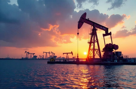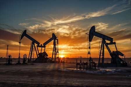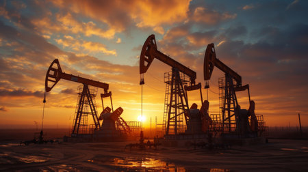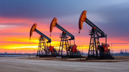 A breathtaking view of oil pumps against a colorful sunset sky, capturing the essence of industrial energy production in a tranquil landscape.