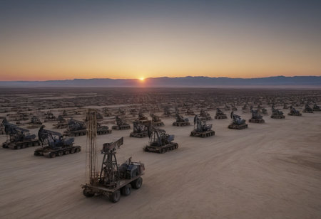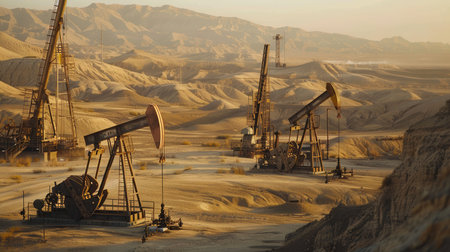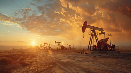 Drilling derricks extract crude oil from the ground in a vast desert oilfield under a warm sunrise.