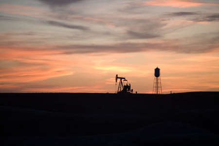 industry sunset - pumpjack and water tower shot silhouetted on a hill in rural Wyoming