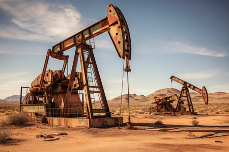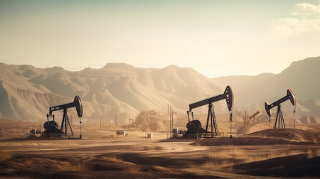 Oil drilling derricks at desert oilfield for fossil fuels output and crude oil production from the ground. Oil drill rig and pump jack background, generative ai