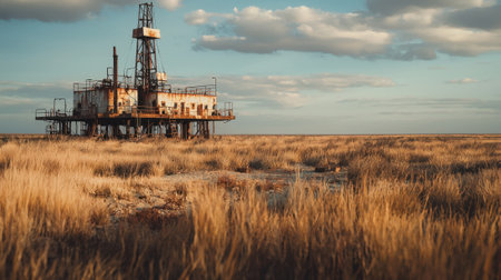 An abandoned oil rig rises amidst golden grassland as the sun sets, casting a warm glow on the rusted structure. The scene evokes a sense of isolation and quiet decay.