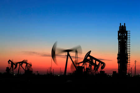 Oil pump jacks at sunset sky background. Toned.