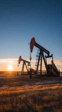 Vertical shot of two pumpjacks silhouetted against a vibrant sunrise sky over golden fields. The sun's glow illuminates the landscape, emphasizing industrial energy production.