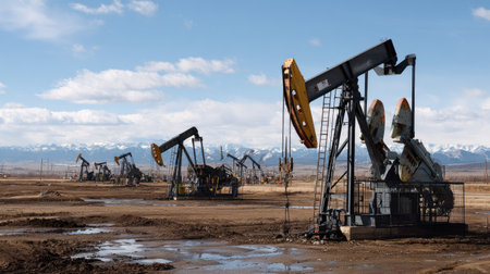 A serene image captures oil pump jacks at work in a vast outdoor setting. The machinery operates against a backdrop of mountains and a bright blue sky, showcasing the industrial aspect of energy production in a natural landscape.